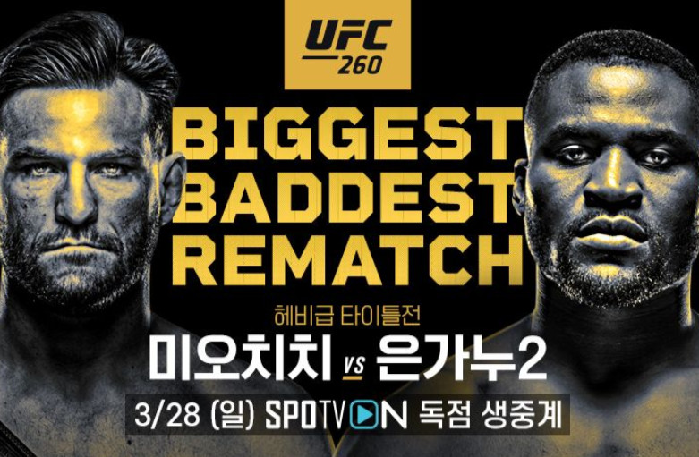 ufc 260 메인카드경기는 3/28 (일) 오전 11시부터 SPOTV ON 독점 생중계가 됩니다. 메인카드 경기는 총 5경기 이므로 마지막에 치뤄지는 미오치치와 은가누 경기는 12시~1시쯤 진행될것으로 예상됩니다. 앞경기 시간에 따라 달라질 수 있습니다.