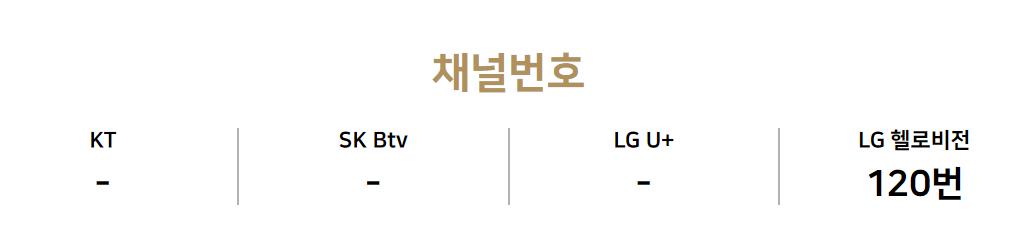 채널번호는 lg헬로비전 기준으로 120번에서 시청가능하며 4월 8일 이후에는 116번에서 시청하실 수 있습니다.