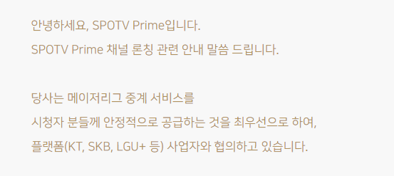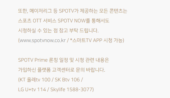 스포티비 프라임(spotv prime)은 메이저리그 중계를 위해 스포티비에서 론칭한 채널입니다. 이번시즌 메이저리그 중계권을 스포티비에서 가지고 가면서 신설하게된 채널로 아직은 초기인 만큼 계약관련하여 협의가 마무리되지는 않은 모습입니다. 현재는 lg헬로비전에서 시청이 가능하다고 합니다. 앞으로 kt 올레tv, sk btv, skylife 등 케이블채널들을 통해서도 시청이 가능하도록 한다고 합니다. 또한 딜라이브에서 시청이 가능하도록 채널이 추가되었습니다.
