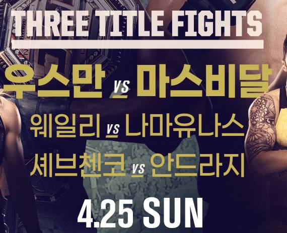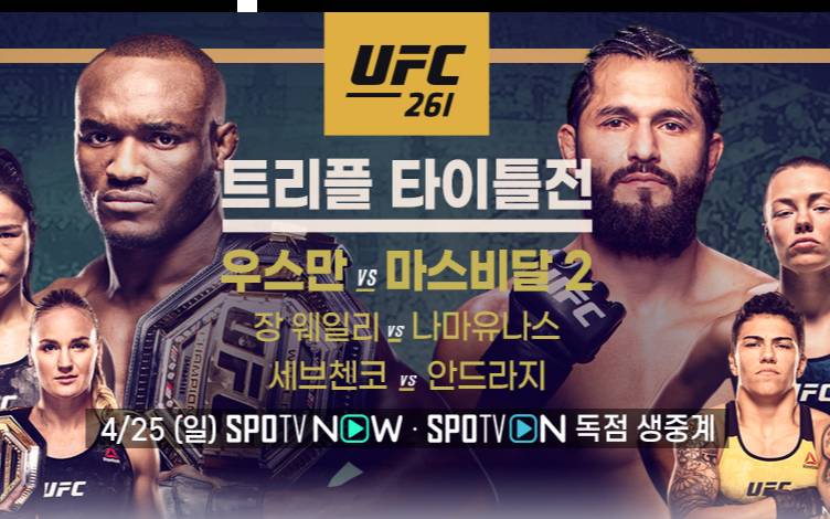ufc 중계 보는 방법 안내입니다. 이번 ufc261에서는 트리플 타이틀전이 예고되어 있습니다. 웰터급 우스만과 마스비달의 2차전부터 아시아 최초의 UFC 챔피언 장 웨일리와 나마유나스의 스트로급 타이틀전, 세브첸코와 안드라지가 맞붙는 플라이급 타이틀전까지 놓치지 마세요.