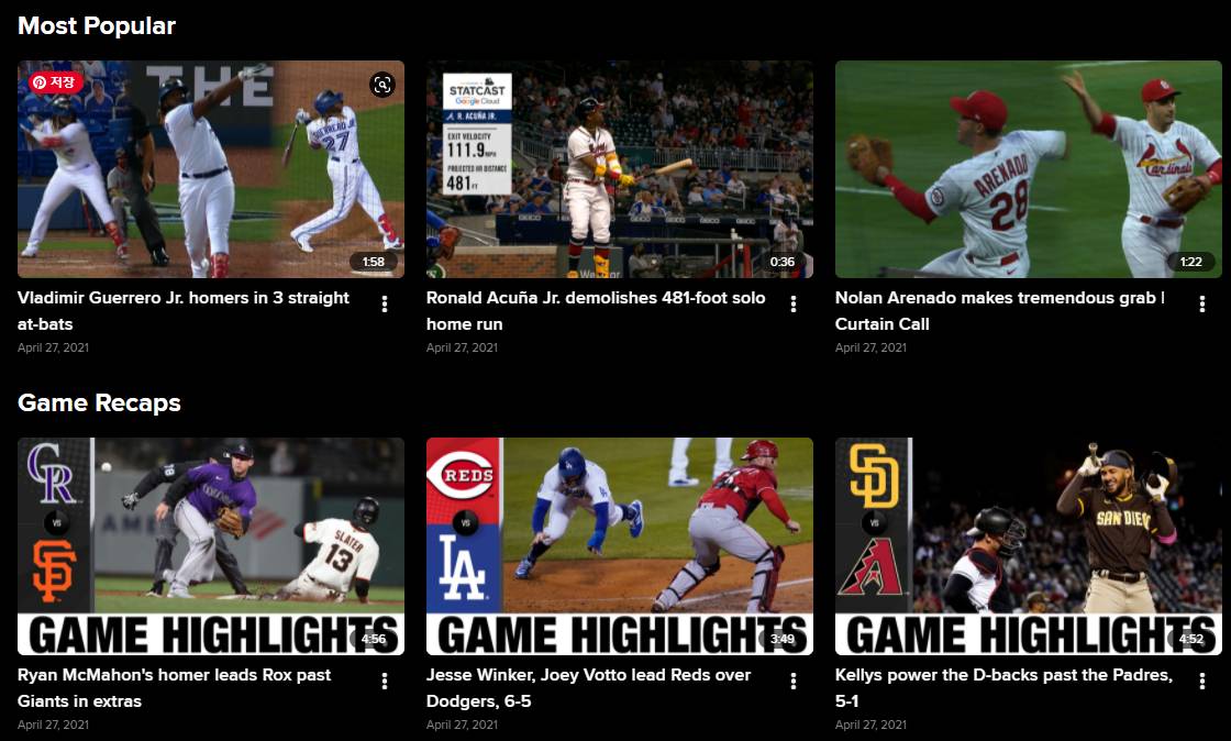 mlb.com에 접속해보시면 주요 메이저리그 경기들을 하이라이트로 시청이 가능합니다. 명장면들을 위주로 올려주기 때문에 야구팬이라면 꼭 알고 있으야할 사이트라 할 수 있겠습니다. 메이저리그 하이라이트 시청하는곳 정보 잘 알아두시면 좋겠습니다.