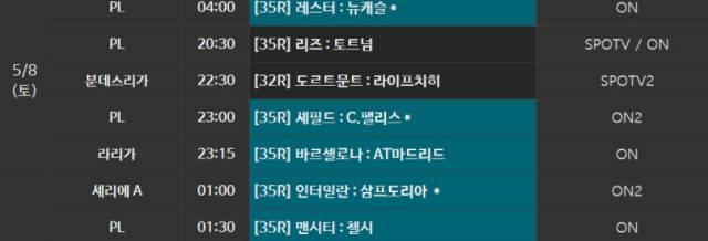손흥민의 이번 경기는 챔피언스리그 진출을 노리는 토트넘 입장에서 반드시 이겨야할 경기입니다. 이번경기는 토트넘과 리즈의 epl35라운드 경기로 시즌 막바지에서 승점차를 좁혀야 하는 토트넘이 꼭 잡아내야할 경기이기 때문에 양팀 모두 최선의 전력으로 임할 것으로 예상됩니다. 경기 중계는 5월 8일 20시 30분부터 시작됩니다. 경기 보기에 정말 좋은 시간대입니다. 손흥민 중계는 올시즌 spotv와 spotvon에서 시청할 수 있습니다. 다른방법으로는 쿠팡플레이를 이용해볼 수 도 있습니다. 자세한 방법은 아래내용을 참고해보시면 좋습니다.