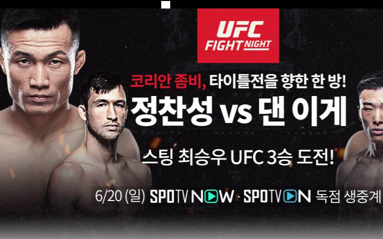 UFC 정찬성 댄이게 중계 방송 보는 방법과 경기 안내를 드리도록 하겠습니다. 코리안좀비 정찬성 선수가 타이틀전을 향해 다시 도전을 이어갈 수 있을지 중요한 매치업입니다. 정찬성과 댄 이게의 UFC경기 중계방송 시청하는곳 확인해보시고 정찬성의 승리를 응원해주세요. 이번 대회에서는 스팅 최승우 선수가 UFC 3승을 향해 도전을 이어나갑니다. 이 경기도 함께 보시면 좋겠네요.