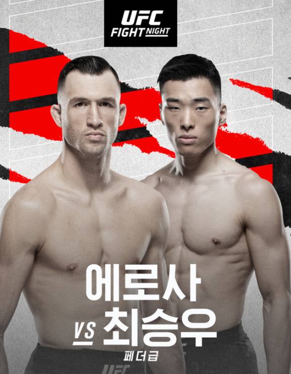최승우와 에로사의 경기도 같은날 펼쳐지게 됩니다. 페더급에서 UFC2연승에 성공한 최승우는 베테랑 줄리안 에로사를 만나게 됩니다. 언더카드에 출전하게 되는 최승우선수도 이번경기에서 승리하여 더 높은곳으로 올라갈 수 있으면 좋겠습니다.