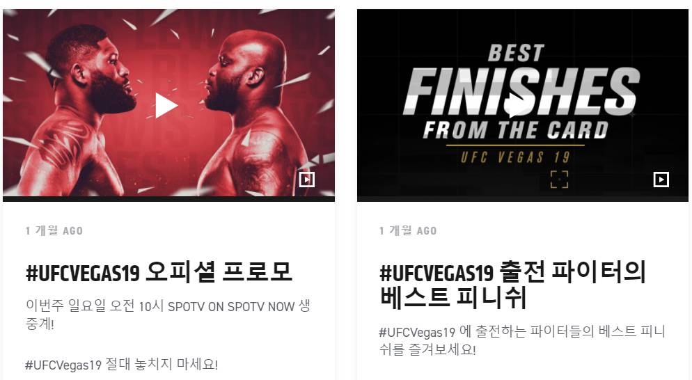 UFC의 여러 중계 영상을 보시려면 UFC 공식 홈페이지를 이용해보는 방법도 좋습니다. 이 UFC공식홈페이지 사이트에서는 UFC 최신 하이라이트 영상, 각종 피니쉬영상, 주요선수들의 영상들을 무료로 볼 수 있게 해주고 있습니다. 접속해보시면 아래와 같은 UFC 하이라이트 영상등을 모아두고 있습니다. 생중계까지는 아니지만 그래도 최신 영상들을 보실 수 있으니 확인해보면 좋겠습니다.