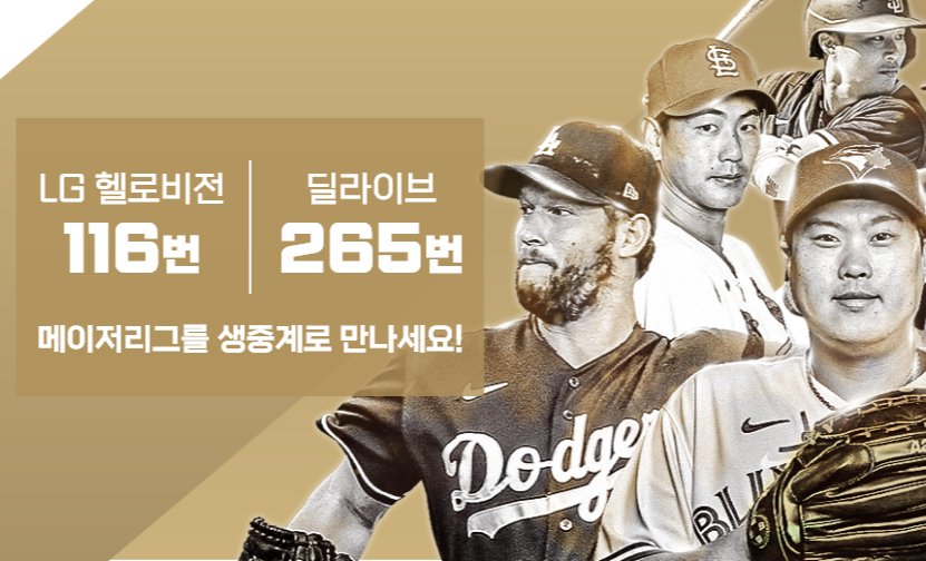 서울인천/경기부산/울산/경남대구/경북대전/충청/세종광주/전라강원/제주 지역 모두 lg 헬로비전은 116번, 딜라이브는 265번에서 류현진 중계를 보실 수 있습니다. 지역마다 볼 수 있는 채널이 조금씩 다르니 확인이 필요합니다.