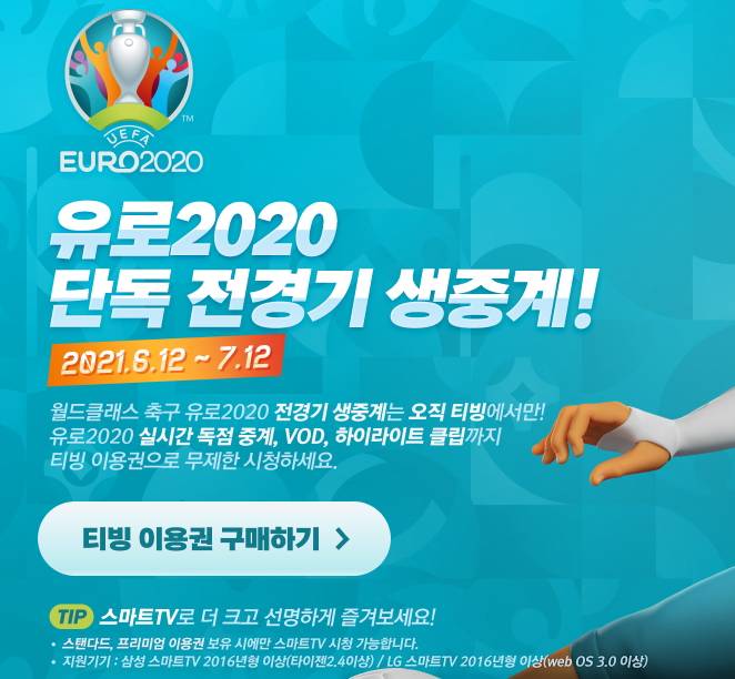 유로 2020은 티빙을 통해 단독으로 생중계 시청이 가능합니다. 실시간 독점중계를 하고 있으므로 티빙 이용권을 이용해보는방법이 좋습니다. 관련 안내는 위쪽에 남겨두었으니 확인을 부탁드립니다. 스마트tv로 더 크고 선명하게 보실 수도 있습니다. (스탠다드, 프리미엄 이용권)