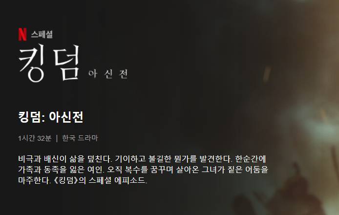 킹덤 아신전을 보시는 분들은 킹덤 시즌1, 시즌2를 꼭 보시길 바랍니다. 혹시 보셨다면 다시한번 다시보기를 통해 작품속 인물과 배경들을 다시 느껴보시는걸 추천드립니다. 다시보기 역시 넷플릭스 회원이라면 무제한으로 시청할 수 있습니다.