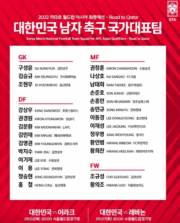 한국 축구 국가대표팀의 카타르월드컵 최종예선 명단이 확정 발표되었습니다. 카타르 월드컵 아시아지역 최종예선 1,2차전 대한민국 이라크, 대한민국 레바논 경기에 출전할 선수 명단이 정해졌습니다.