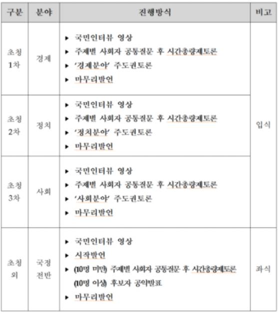 대선토론 1차는 경제분야를 주제로 토론을 합니다. 2차 대선토론은 정치분야 주도권 토론을 하게 됩니다. 초청 3차는 사회분야 주도권 토론을 하게게 됩니다. 초청외 토론의 경우 주제별 사회자 공통질문 후 시간총량제토론, 후보자 공약 발표로 마무리 하게 됩니다.