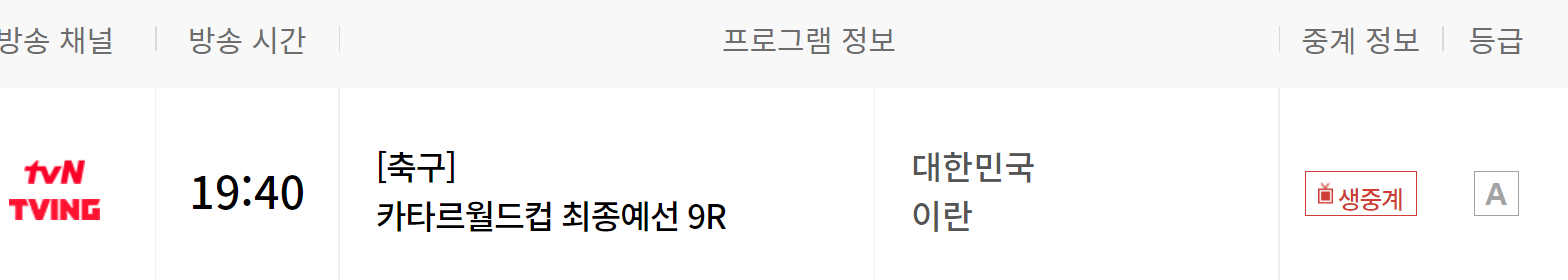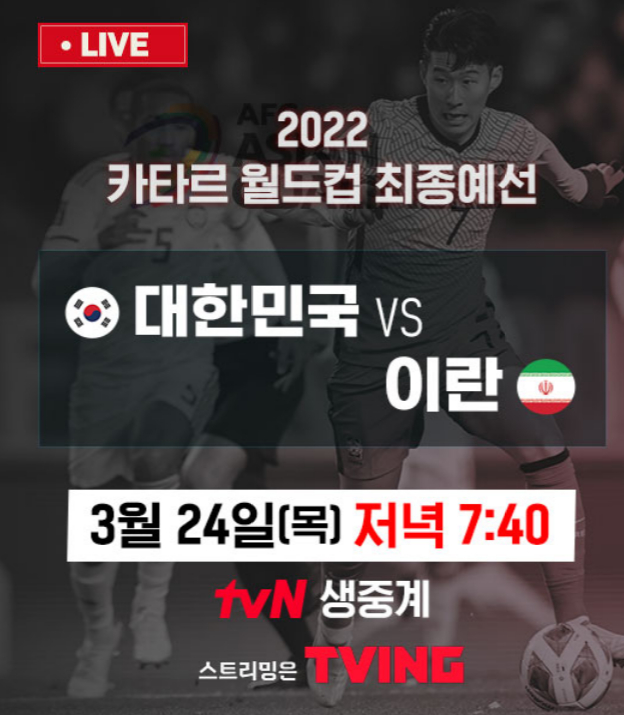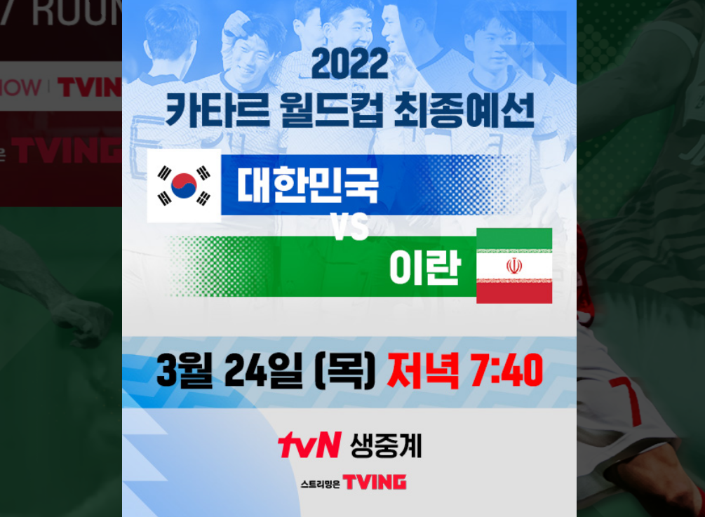 카타르월드컵 최종예선 경기 대한민국과 이란의 경기는 tvN, TVING을 통해 시청이 가능합니다. 생중계 방송으로 시청해보실 수 있습니다. tv로 보시려면 tvN채널을 이용해서 보시는게 가장 쉬운 방법입니다.