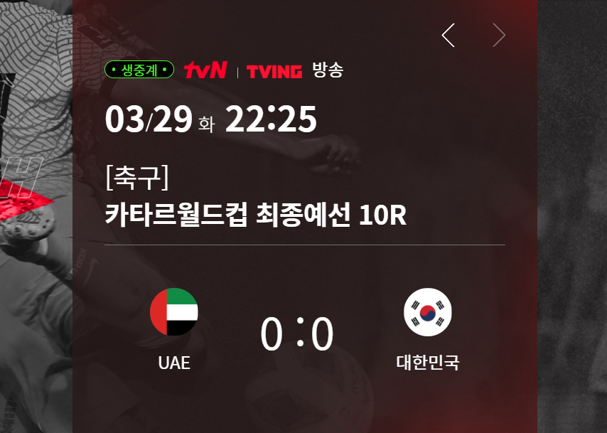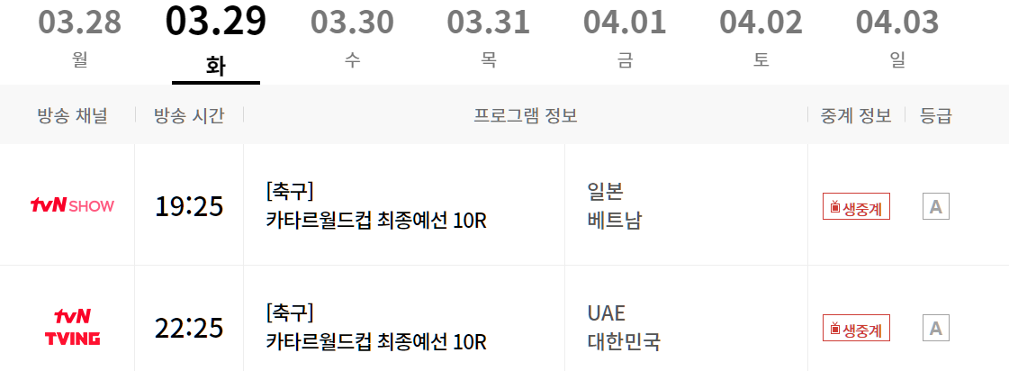 카타르월드컵 최종예선 경기로 펼쳐지는 아랍에미리트와 대한민국의 경기는 3월 29일 화요일 밤 10시 25분부터 생중계 예정입니다. 중계방송 채널은 tvN에서 생중계방송으로 진행되며 스트리밍 서비스는 tving을 이용해보시면 쉽게 보실 수 있겠습니다. 아래 중계 채널을 확인해보세요.