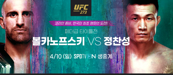 정찬성 볼카노프스키 중계방송 시청 안내입니다. ufc273에서 정찬성과 볼카노프스키가 맞대결을 펼치게 됩니다. 챔피언 벨트를 놓고 겨루는 이번 승부는 정찬성에게 매우 중요한 한판이 될 것입