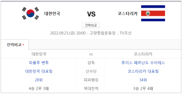 월드컵을 앞두고 있는 대한민국 축구 국가대표팀 평가전으로 대한민국과 코스타리카의 경기가 펼쳐집니다. 9월 23일 20시부터 고양 종합운동장에서 진행될 이번 경기는 손흥민, 김민재, 이강인, 황의조 등 해외파까지 모두 총 출동하는 최종점검 성격의 경기 입니다. 한국과 코스타리카 경기 중계방송은 아래 중계 사이트를 확인해보시면 쉽게 무료 시청해보실 수 있습니다.
