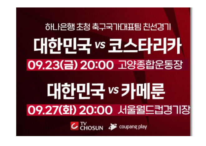 대한민국과 코스타리카의 축구 평가전이 끝나고 나면 이어서 카메룬과의 경기가 예정되어 있습니다. 9월 27일(화) 20시부터 펼쳐질 이번경기는 역시 tv조선과 쿠팡플레이를 이용해 시청해보실 수 있겠습니다.