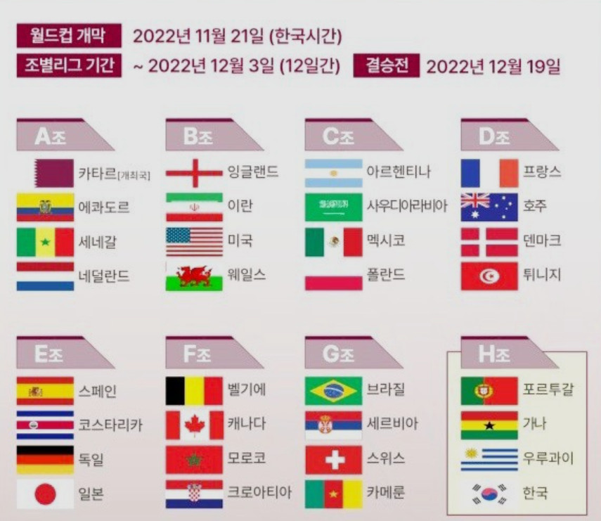 카타르 월드컵 결승전은 2022년 12월 19일에 진행됩니다. 이번 월드컵 조편성은 다음과 같습니다.