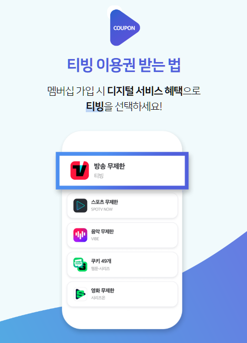 티빙 이용권을 받는 방법은 아래 방법처럼 멤버십 가입시 디지털 서비스 혜택으로 티빙을 선택해보시면 됩니다.