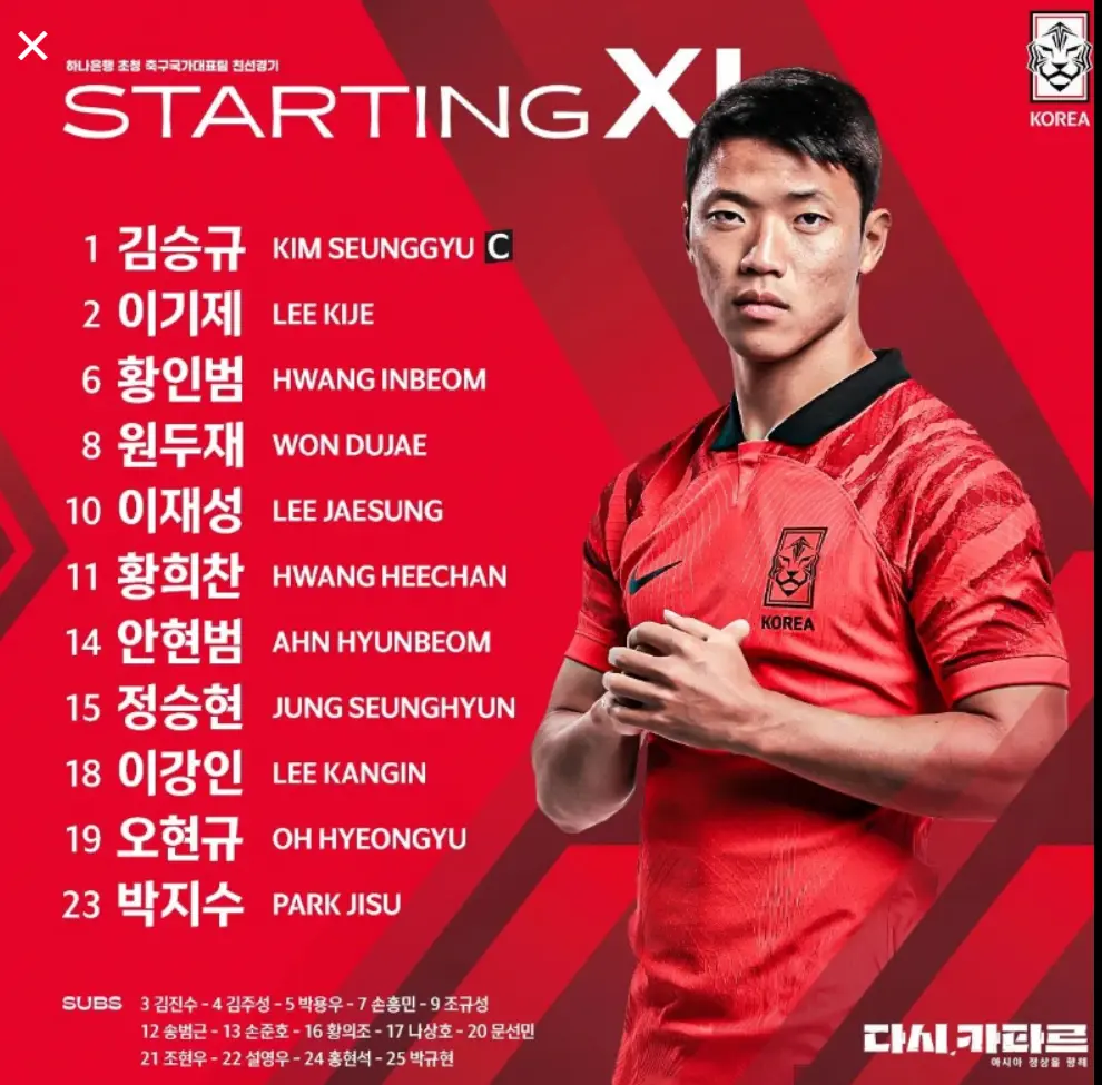 한국은 손흥민 대신 주장 완장을 찬 골키퍼 김승규를 필두로 이강인, 오현규, 황희찬, 원두재, 이재성, 황인범, 이기제, 안현범, 박지수와 정승현이 선발로 나선다. 손흥민은 벤치에서 시작합니다.