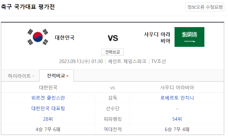 대한민국 vs 사우디아라비아 축구 국가대표 경기 중계