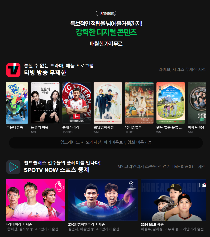 엘지 유플러스 뿐만아니라 KT에서도 5G 무제한 요금제로 티빙 지니 초이스 플랜을 가입하시게 되면 티빙 베이직이나 지니 중에서 무료로 이용하실 수 있는 방법이 있습니다.