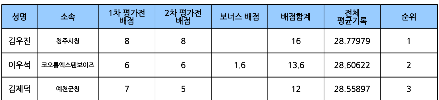 파리올림픽 국가대표 선발전 결과입니다. 김우진 선수가 전체 순위 1위로 남자부에서 통과하였고 이우석선수가 2위, 김제덕 선수가 3위로 국가대표에 선발되었습니다.
