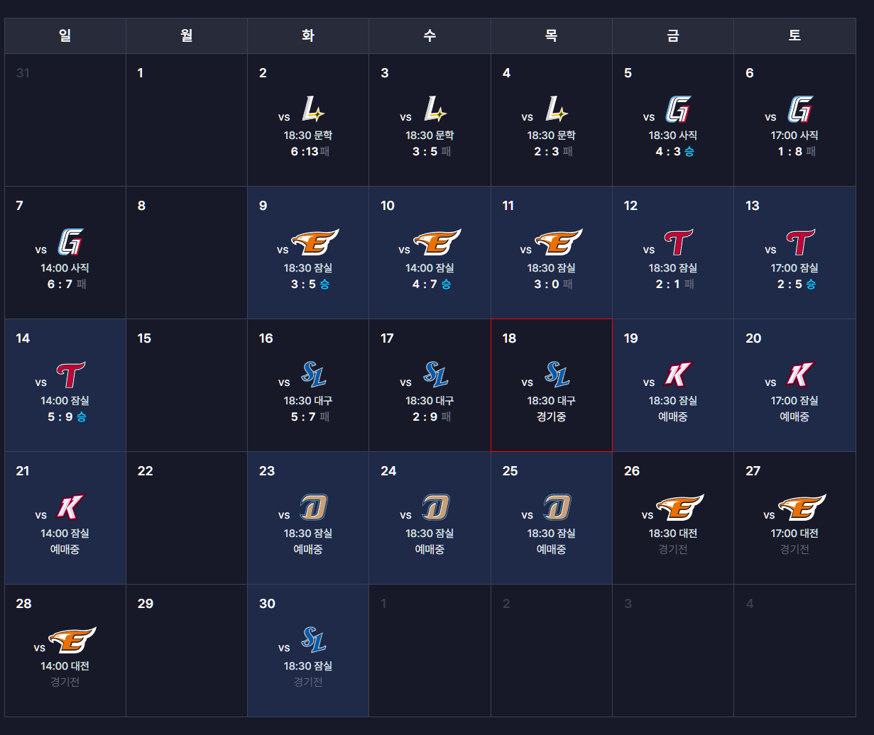 다른 방법으로는 두산베어스 공식 홈페이지 경기일정탭을 통해 경기 결과, 일정을 한눈에 보실 수 있습니다.