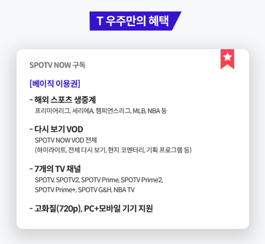SKT 사용자라면 T멤버십 우주패스 LIFE 구독을 통해 스포티비나우를 저렴하게 이용할 수 있습니다. 우주패스 LIFE는 세븐일레븐, 투썸플레이스 등 다양한 할인 혜택도 제공해, 스포티비나우 이용권 외에도 다양한 혜택을 누릴 수 있습니다. 저 역시 이 방법으로 구독을 진행했고, 다양한 혜택을 함께 누릴 수 있어 매우 만족하고 있습니다.