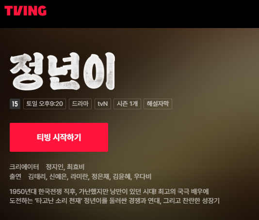 정년이 재방송 보기는 티빙, u+ 모바일 tv, 디즈니플러스 등에서 이용해보실 수 있습니다. 시리즈온에서도 원작 정년이를 보실 수 있습니다. 이중에서 추천드리는 방법은 tving에서 제공하는 재방송 서비스를 이용해보시거나 tvn, tvn 드라마 채널을 이용해보시는것이 좋겠습니다. 자세한 방법은 아래에 남겨드립니다.