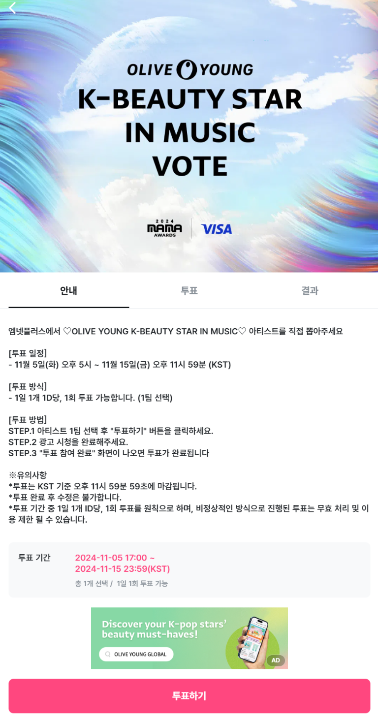 마마 2024의 투표 일정이 발표되면서 많은 팬들이 궁금해하는 투표 방법도 알아보곘습니다.. 투표는 크게 두 가지 방법으로 진행됩니다.