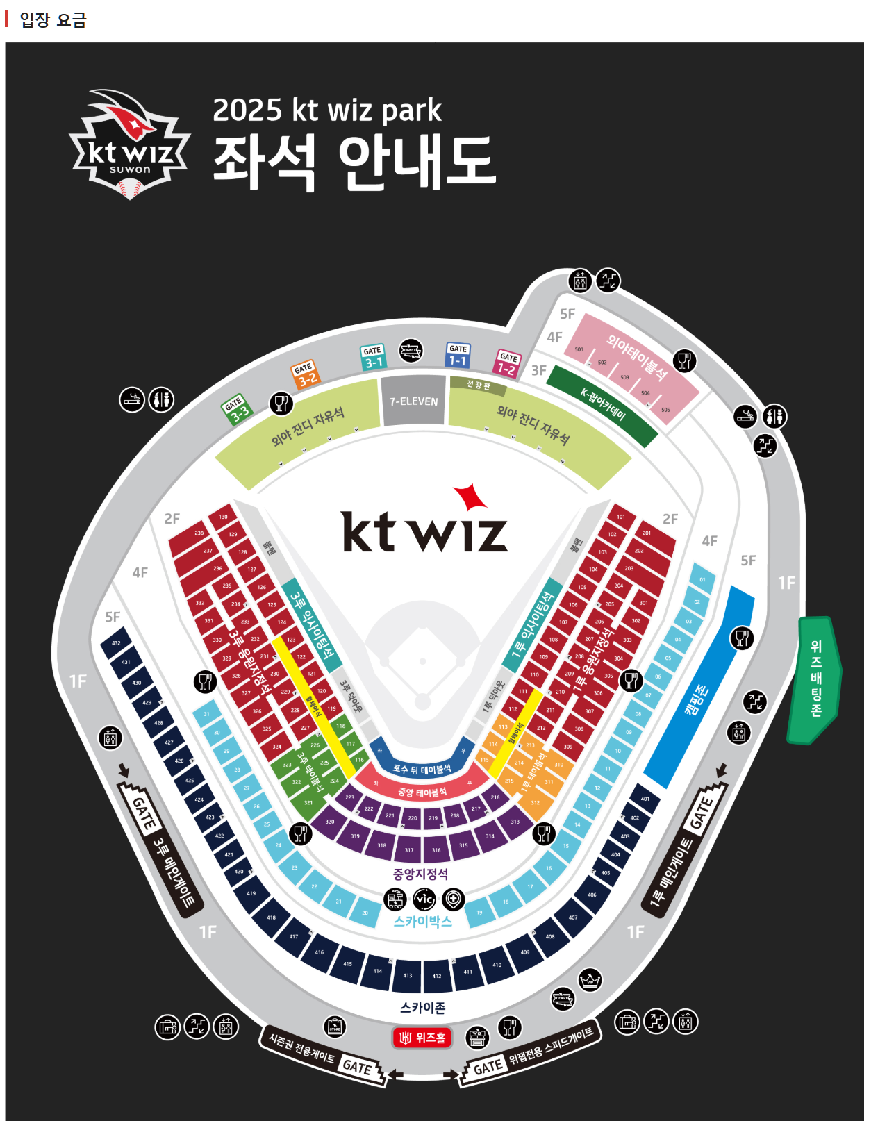kt 홈구장 좌석배치와 티켓 가격입니다.