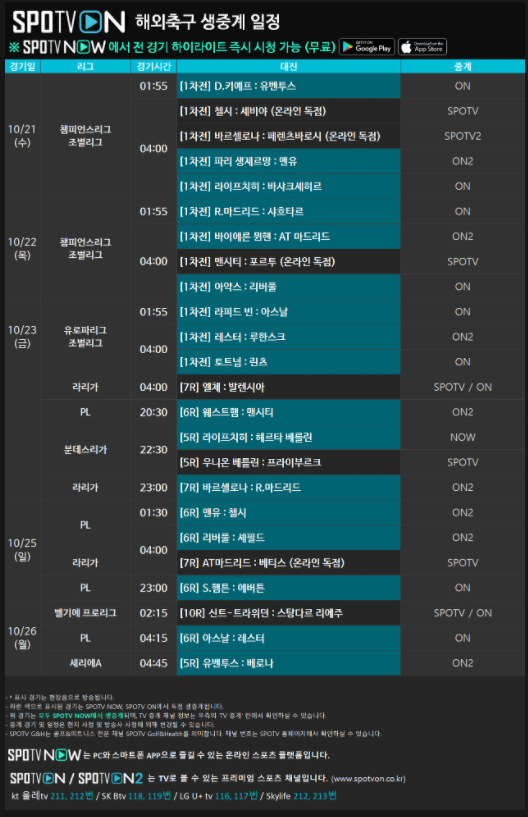 또하나의 빅매치인 바이에른뮌헨과 아틀래티코 마드리드의 경기 1차전은 10월22일 목요일 4시부터 시작됩니다. 스포티비온2 채널에서 중계방송을 시청하실 수 있습니다.