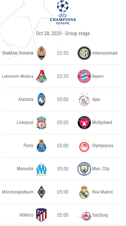 모스크바와 바이에른 뮌헨, 리버풀과 미트윌란, 맨시티와 마르세유, 첼시와 크라스노다르, 도르트문트와 제니트, 맨유와 라이프치히, 유벤투스와 바르셀로나 등 여러 경기들이 예정되어 있습니다.